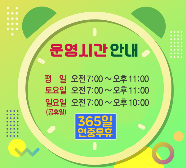 직장인을 위해 평일 오전7시부터 오후11시까지 연장 운영됩니다. 지방(제주,부산,광주,대구 등 타지역) 거주하시는 분들과 초.중.고등학생이 치료 받으실 수 있도록 토요일 및 일요일 정상 운영 됩니다.